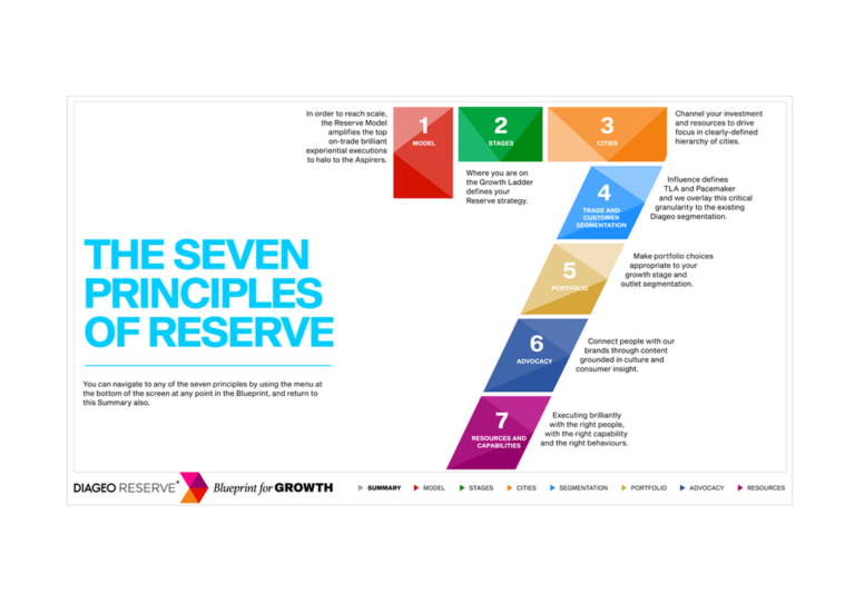Interactive 200 page PDF visualising 5 year Strategy for Diageo’s Reserve brands.
