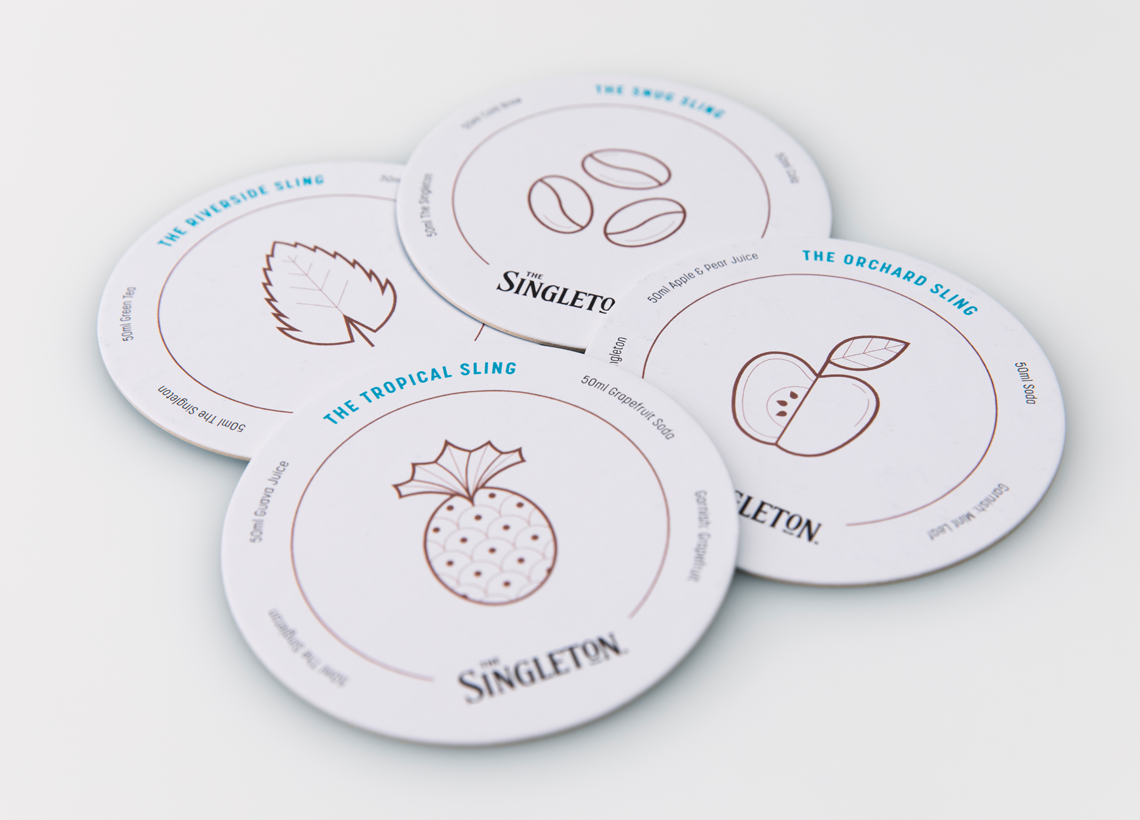 We created a series of icons to represent the flavours in four key serves, which were then applied to coasters and other touchpoints.